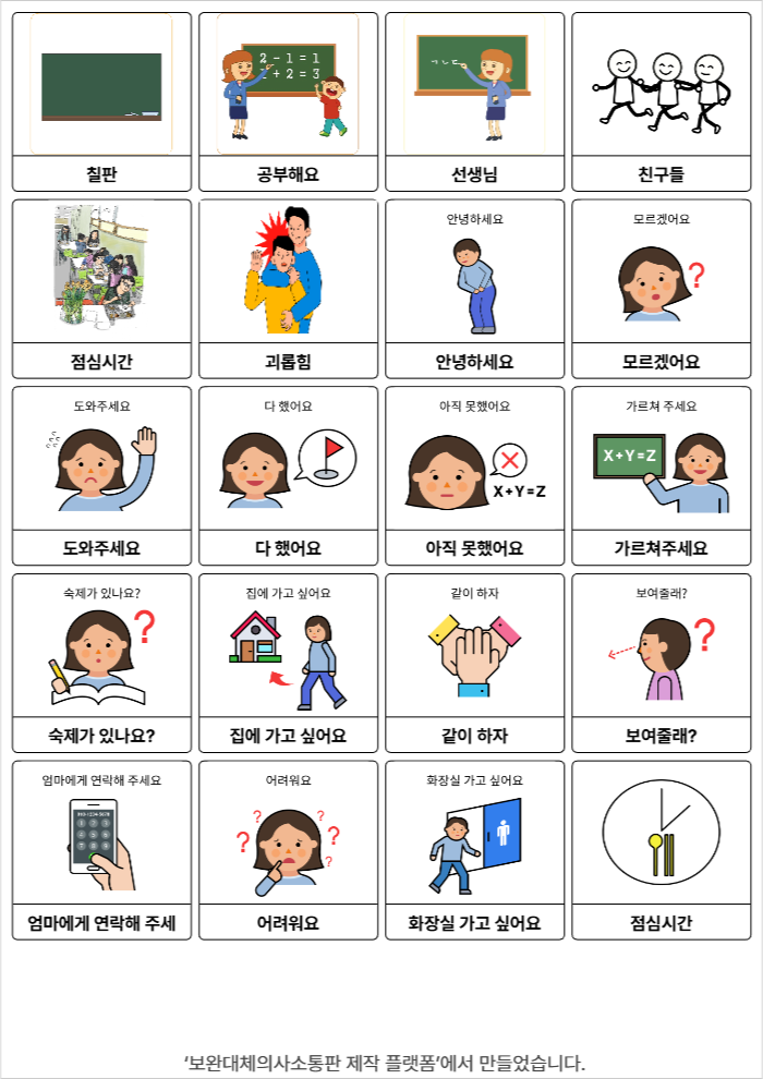칠판,공부해요,선생님,친구들,점심시간,괴롭힘,안녕하세요,모르겠어요,도와주세요,다 했어요,아직 못했어요,가르쳐주세요,숙제가 있나요?,집에 가고 싶어요,같이 하자,보여줄래?,엄마에게 연락해 주세요,어려워요,화장실 가고 싶어요,점심시간