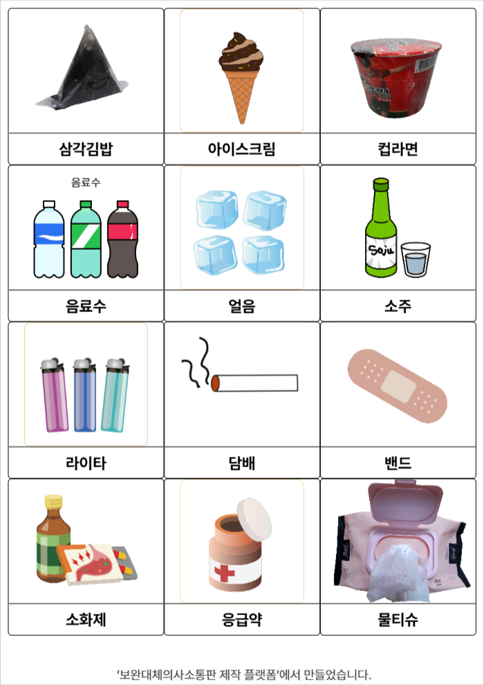 삼각김밥,아이스크림,컵라면,음료수,얼음컵,주류,라이타,담배,밴드,소화제,해열제,물티슈광주광역시 서구장애인복지관25/12/16