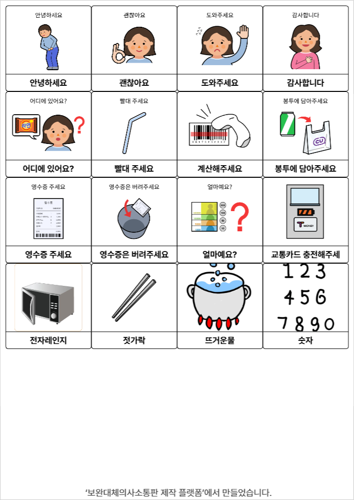 안녕하세요,괜찮아요,도와주세요,감사합니다,어디에 있어요?,빨대 주세요,계산해주세요,봉투에 담아주세요,영수증 주세요,영수증 버려주세요,얼마예요?,교통카드 충전,전자레인지,젓가락,뜨거운물,숫자서지우25/12/17