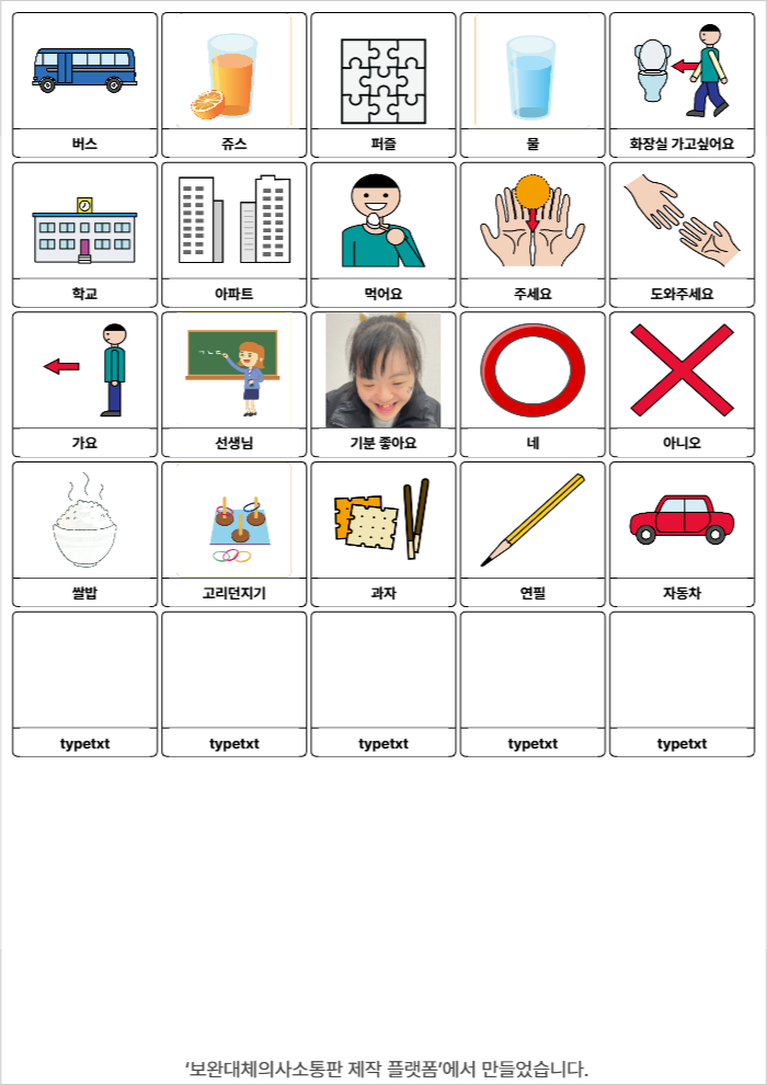 버스,쥬스,퍼즐,물,화장실 가고싶어요,학교,집,먹어요,주세요,도와주세요,가요,선생님,나,좋아요,싫어요,밥,고리,과자,연필,자동차김수희26/02/11