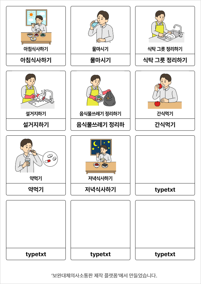아침식사하기,물마시기,식탁 그릇 정리하기,설거지하기,음식물쓰레기 정리하기,간식먹기,약먹기,저녁식사하기윤수빈26/02/11식사