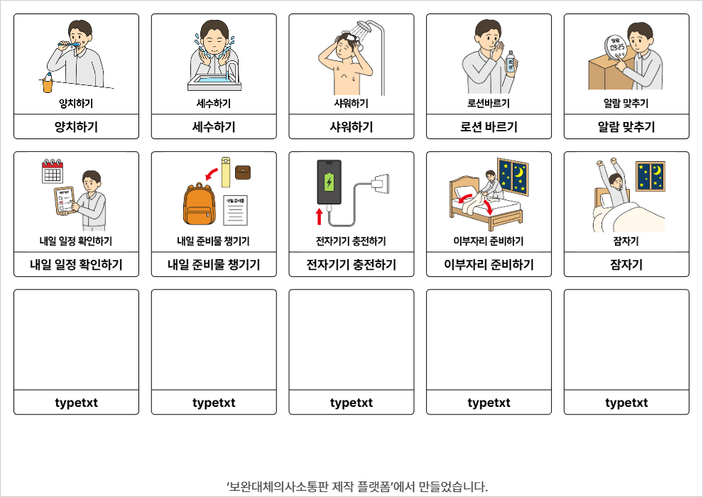 같이,쉬고 싶어요,아파요,배고파요,목말라요,더워요,추워요,화장실 가고 싶어요,네 ,아니오,도와주세요,몰라요이호영26/03/26
