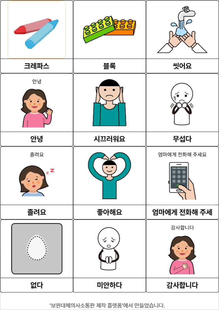 크레파스,블록,씻어요,안녕,시끄러워요,무섭다,졸려요,좋아해요,엄마에게 전화해 주세요,없다,미안하다,감사합니다이호영26/03/26