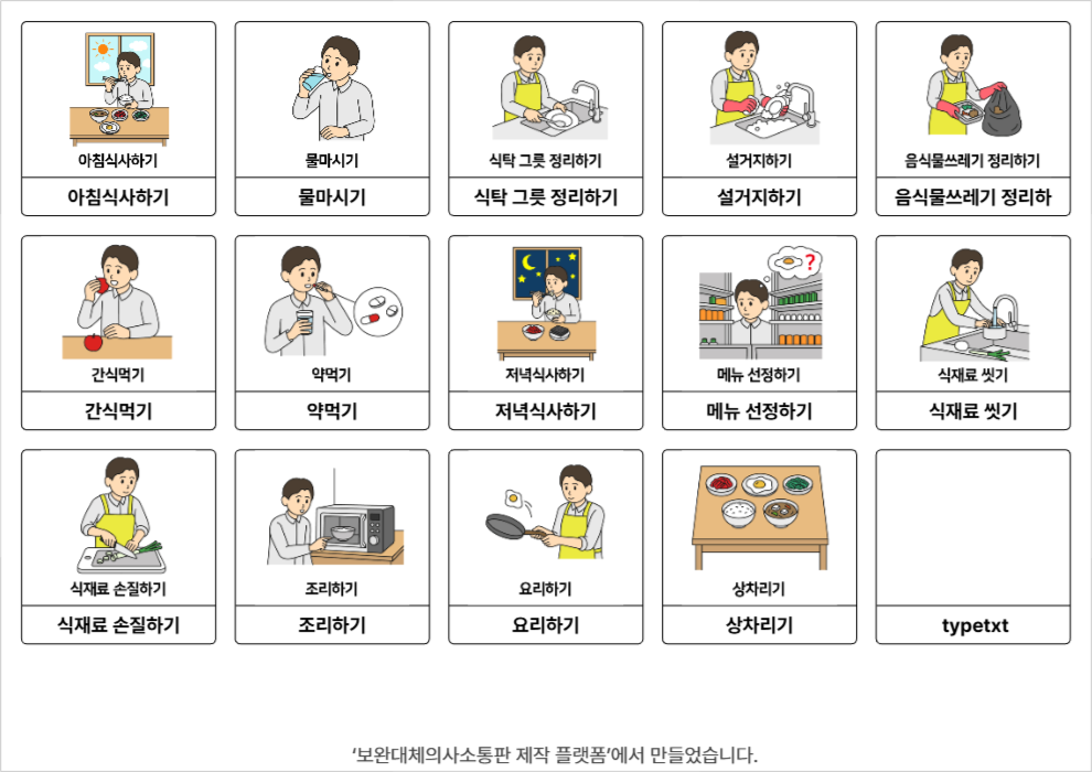 아침식사하기,물마시기,식탁 그릇 정리하기,설거지하기,음식물쓰레기 정리하기,간식먹기,약먹기,저녁식사하기,메뉴 선정하기,식재료 씻기,식재료 손질하기,조리하기,요리하기,상차리기윤수빈26/03/18식사, 식사준비