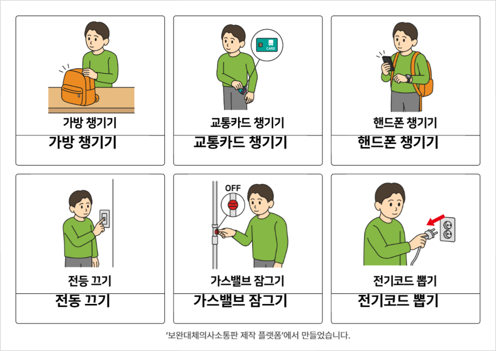 가방 챙기기,교통카드 챙기기,핸드폰 챙기기,전동 끄기,가스밸브 잠그기,전기코드 뽑기윤수빈26/03/18외출 준비