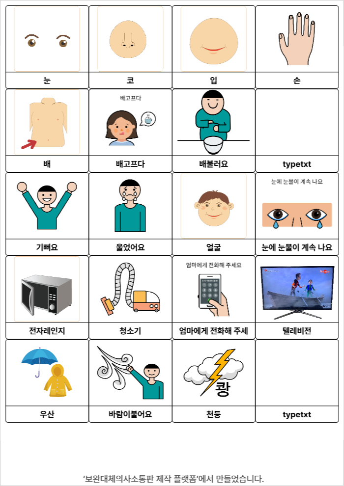 눈,코,입,손,배,배고프다,배불러요,기뻐요,울었어요,얼굴,눈에 눈물이 계속 나요,전자레인지,청소기,엄마에게 전화해 주세요,텔레비전,비가 와요,바람,천둥한신영26/03/131단원