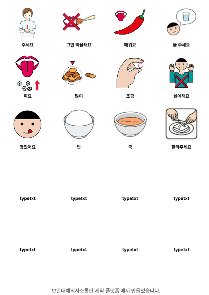 더 주세요,그만 먹을래요,매워요,물 주세요,짜요,많이,조금,싫어요,맛있어요,밥,국,잘라주세요김소연25/11/25핵심어휘 그림상징(급식실)