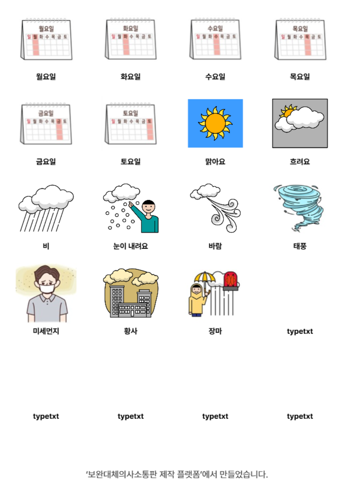 월요일,화요일,수요일,목요일,금요일,토요일,맑음,흐림,비,눈,바람,태풍,미세먼지,황사,장마김소연25/11/25핵심어위 그림상징(요일날씨)