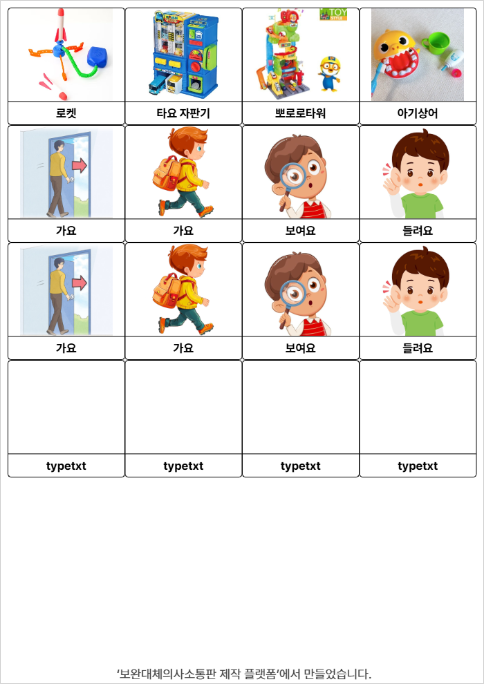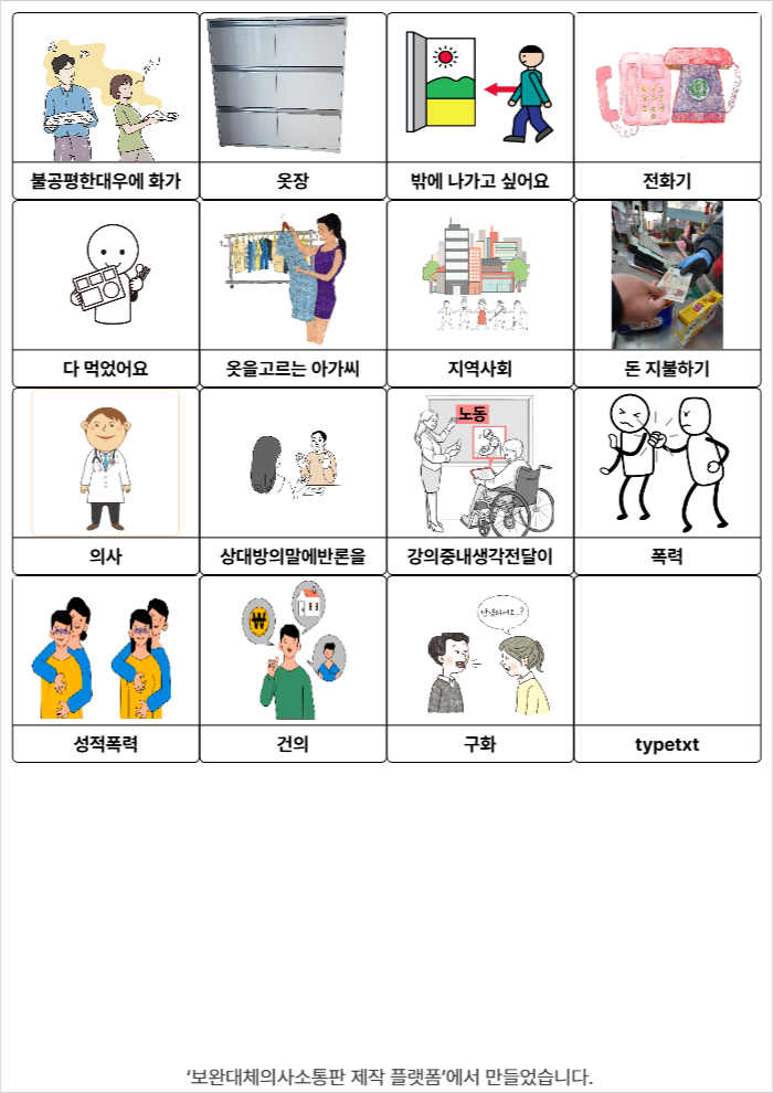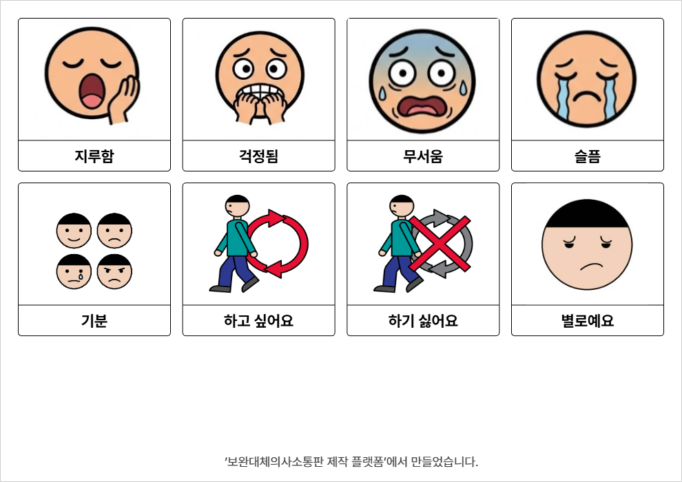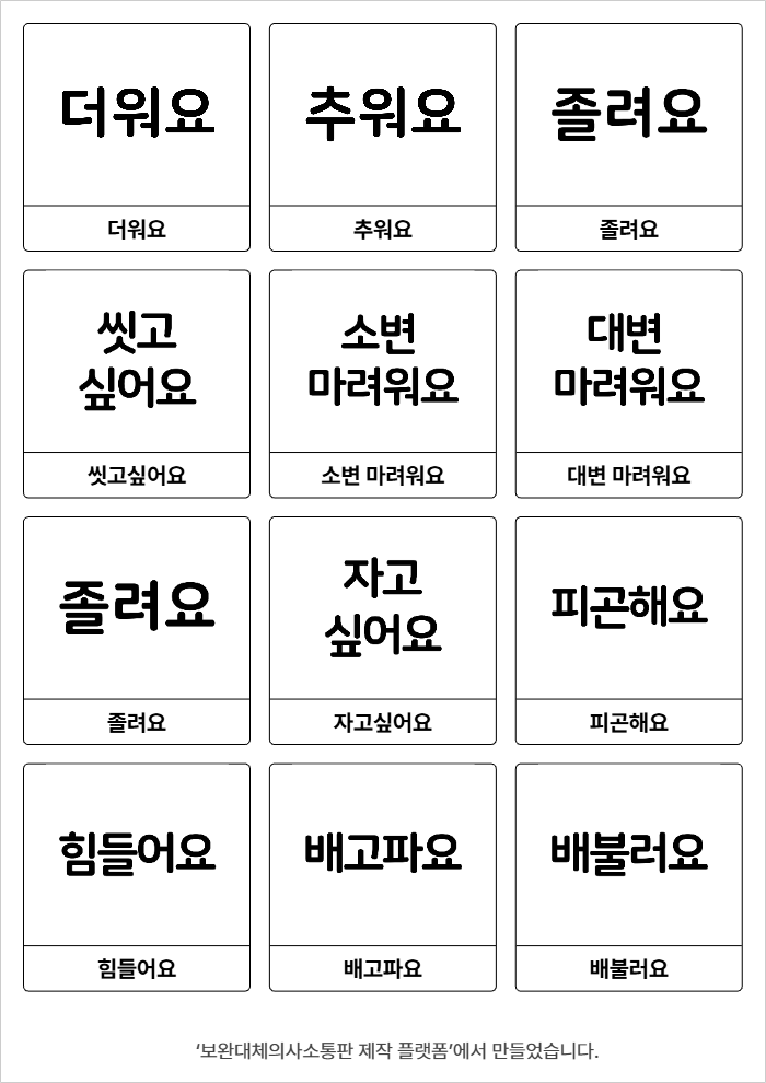 더워요,추워요,배고파요,배불러요,목말라요,씻고싶어요,소변 마려워요,대변 마려워요,졸려요,자고싶어요,피곤해요,힘들어요,도와주세요,필요해요윤수빈26/02/05
