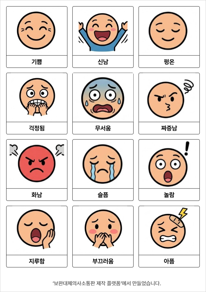 더워요,추워요,졸려요,씻고싶어요,소변 마려워요,대변 마려워요,졸려요,자고싶어요,피곤해요,힘들어요,배고파요,배불러요윤수빈26/02/05표현