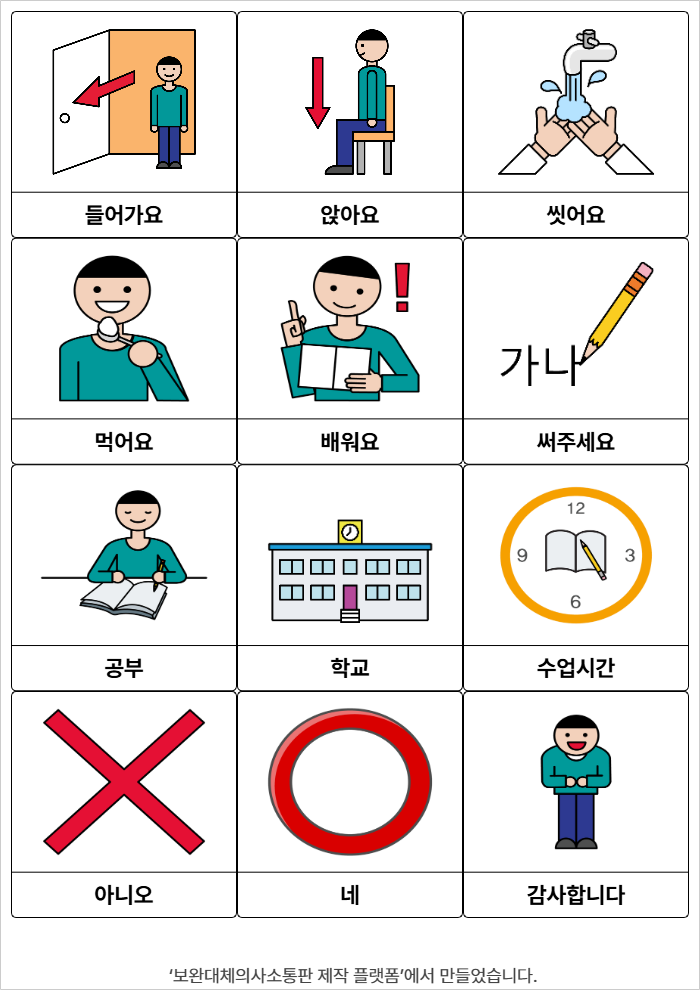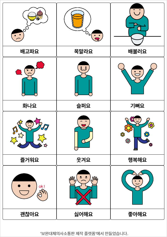 배고파요,목말라요,배불러요,화나요,슬퍼요,기뻐요,즐거워요,웃겨요,행복해요,괜찮아요,싫어해요,좋아해요학교26/03/30