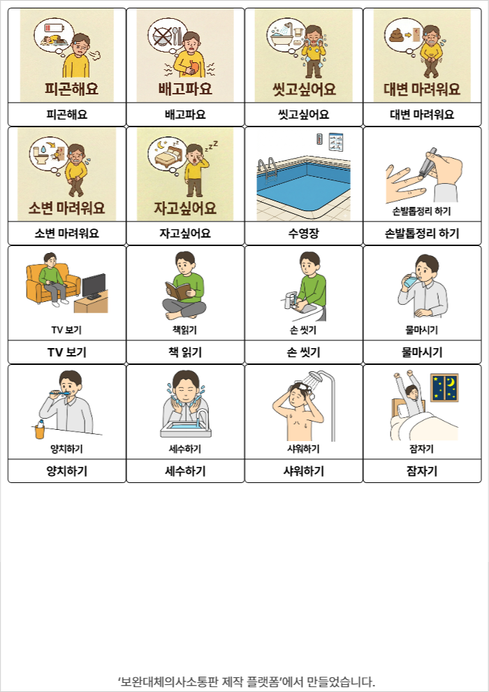 피곤해요,배고파요,씻고싶어요,대변 마려워요,소변 마려워요,자고싶어요,수영장,손발톱정리 하기,TV 보기,책 읽기,손 씻기,물마시기,양치하기,세수하기,샤워하기,잠자기이강열26/03/30