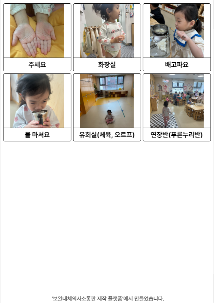 피곤해요,배고파요,씻고싶어요,대변 마려워요,소변 마려워요,자고싶어요,수영장,물,빵,밥,티비,아파요이강열26/03/30