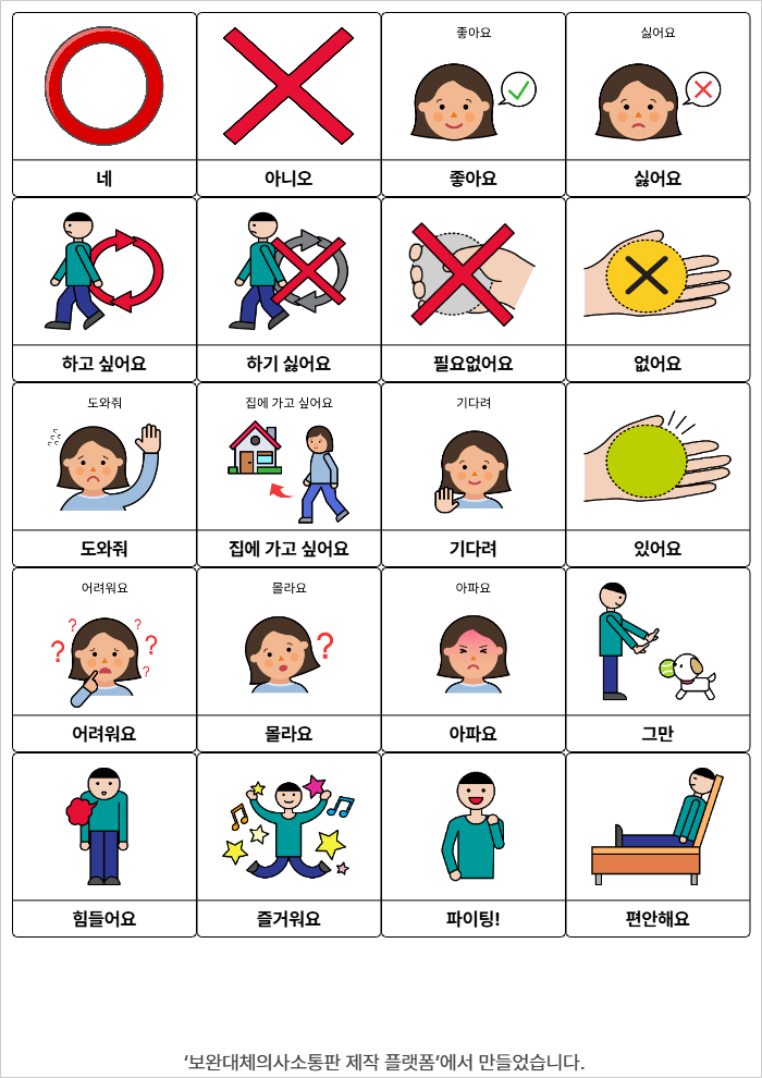네 ,아니오,좋아요,싫어요,하고 싶어요,하기 싫어요,필요없어요,없어요,도와줘,집에 가고 싶어요,기다려,있어요,어려워요,몰라요,아파요,그만,힘들어요,즐거워요,파이팅!,편안해요조현교26/01/23긍정부정표현
