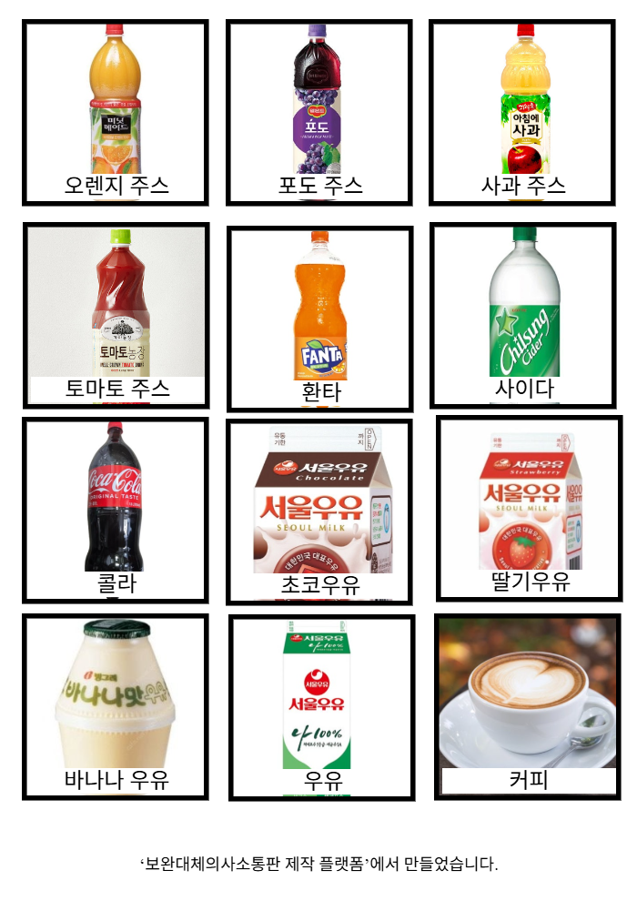 오렌지 주스,포도 주스,사과 주스,우유,초코우유,딸기우유,바나나 우유,커피,토마토 주스,환타,사이다,콜라김수경26/01/26