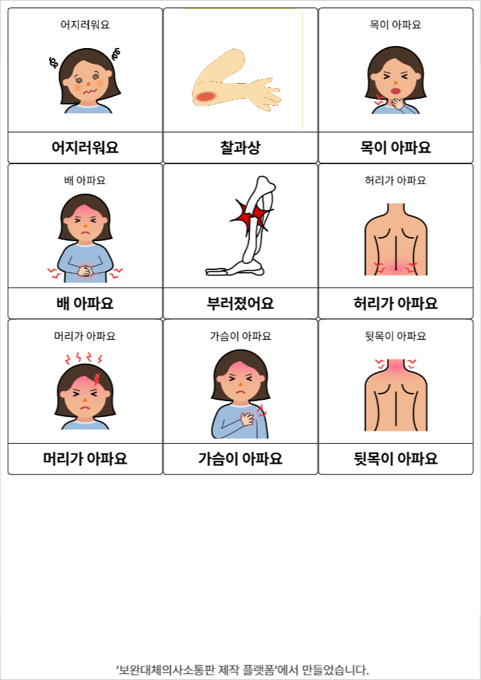 어지러워요,찰과상,목이 아파요,배 아파요,부러졌어요,허리가 아파요,머리가 아파요,가슴이 아파요,뒷목이 아파요보건소26/01/30의료용 증상 aac