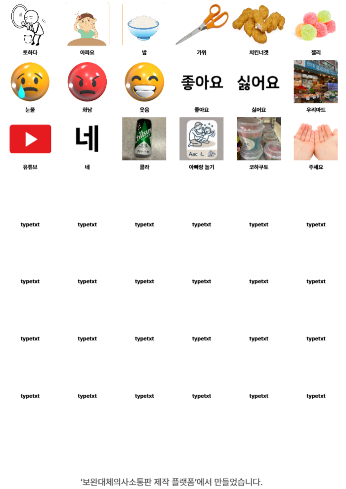 주세요,아파요,밥,가위,눈물,웃음,화남,토하다,씻어요,거품,다이소,시마스시,주먹밥,이마트,놀고싶어요,모래놀이,놀이터,설사해요,배아파요,손가락을 마주 잡고 문질러 주기,버려요,놀이공원,우리마트,코하쿠토,아빠랑 놀기,이가 아파요,아파요,유튜브,목이 아파요,머리가 아파요,까졌어요,밴드,콜라,아니오,네,싫어요,좋아요,우웩,삼겹살,돈까스,카레,소시지,치즈준비,젤리,치킨너겟,교회윤지유26/01/16260116