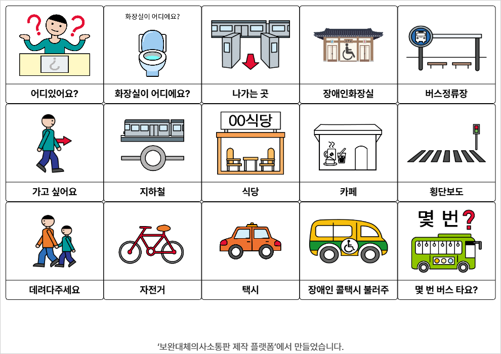 어디있어요?,화장실이 어디에요?,나가는 곳,장애인화장실,버스정류장,가고 싶어요,지하철,식당,카페,횡단보도,데려다주세요,자전거,택시,장애인 콜택시 불러주세요,몇 번 버스 타요?엛25/09/19길 안내(이동지원)
