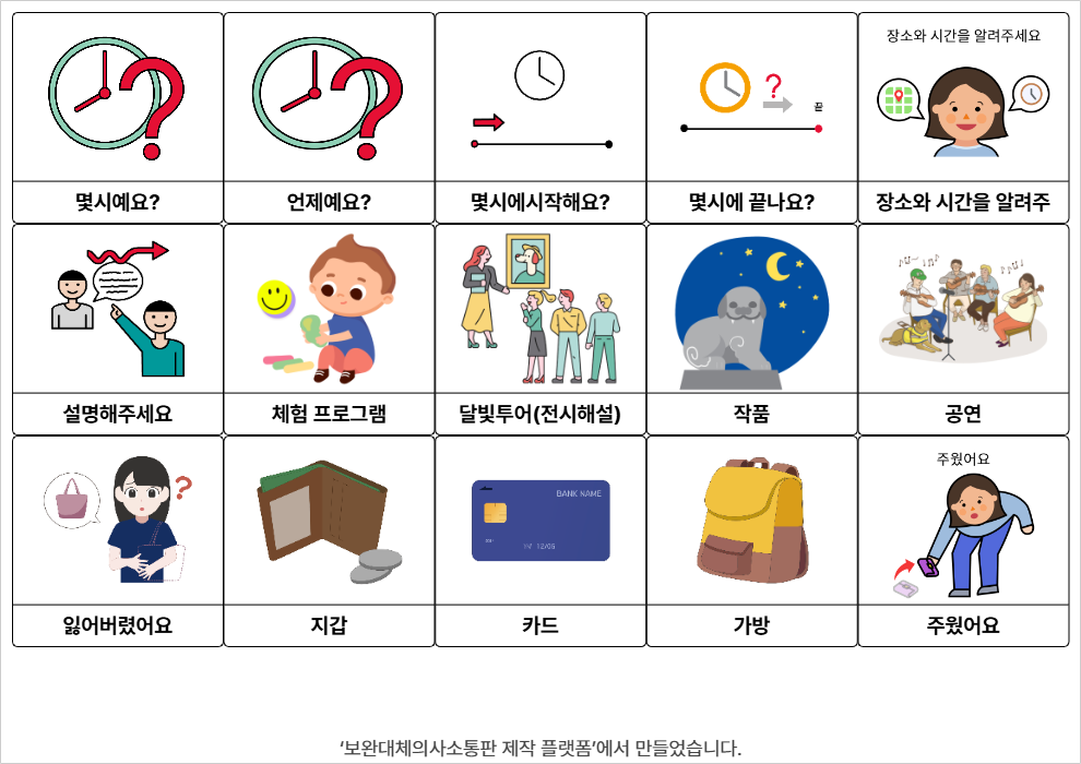 몇시예요?,언제예요?,몇시에시작해요?,몇시에 끝나요?,장소와 시간을 알려주세요,설명해주세요,체험 프로그램,달빛투어(전시해설),작품,공연,잃어버렸어요,지갑,카드,가방,주웠어요엛25/09/19주요 안내