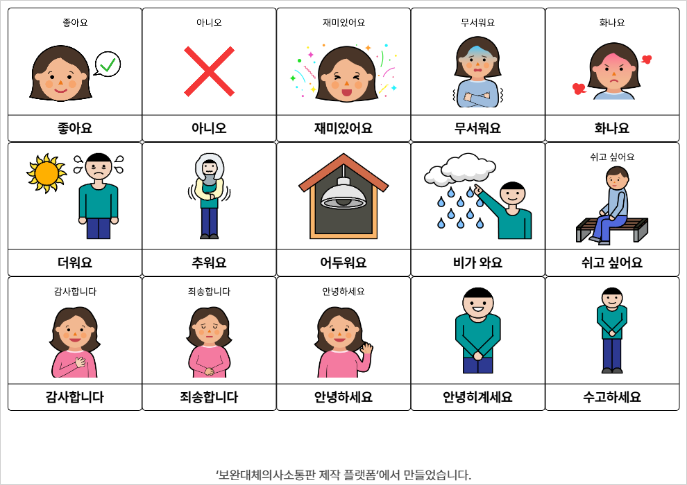좋아요,아니오,재미있어요,무서워요,화나요,더워요,추워요,어두워요,비가 와요,쉬고 싶어요,감사합니다,죄송합니다,안녕하세요,안녕히계세요,수고하세요엛25/09/19감정표현