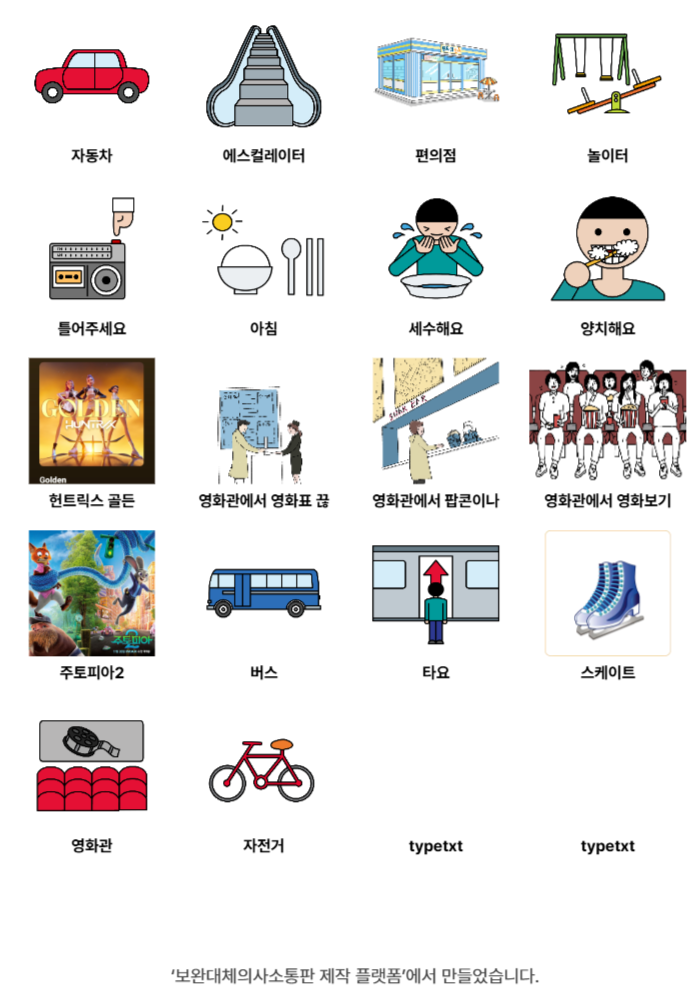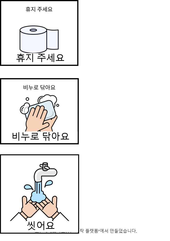 물,밥,국수,반찬,과일,뜨거워요,음식이 짜요,싱거워요,다른거 주세요,안먹을래요,식욕이 없어요,배 아파요,오한,머리가 아파요,목이 부었어요,양치 할게요,세수 할게요,목욕해요,소변,대변,치워주세요,휴지 주세요,더워요,추워요,힘들어요,화나요,우울해요,짜증나요,하기 싫어요,답답해요,피곤해요,시끄러워요,괜찮아요,좋아요,알아요이철수25/11/10가정