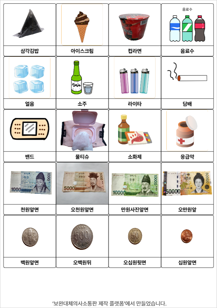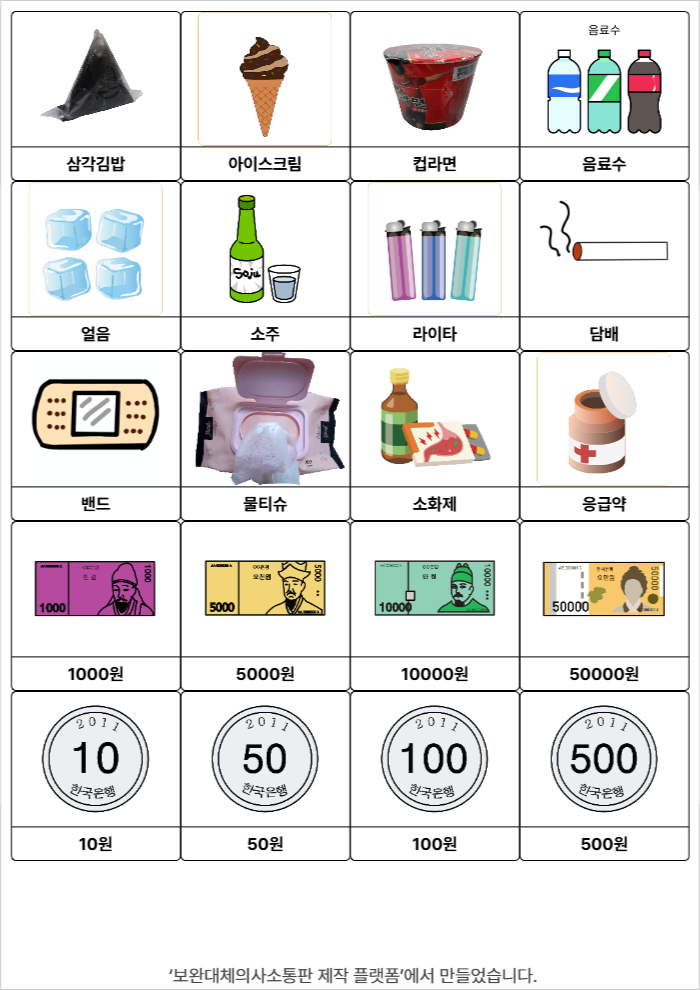 삼각김밥,아이스크림,컵라면,음료수,얼음,소주,라이타,담배,밴드,물티슈,소화제,응급약,1000원,5000원,10000원,50000원,10원,50원,100원,500원서지우25/12/17