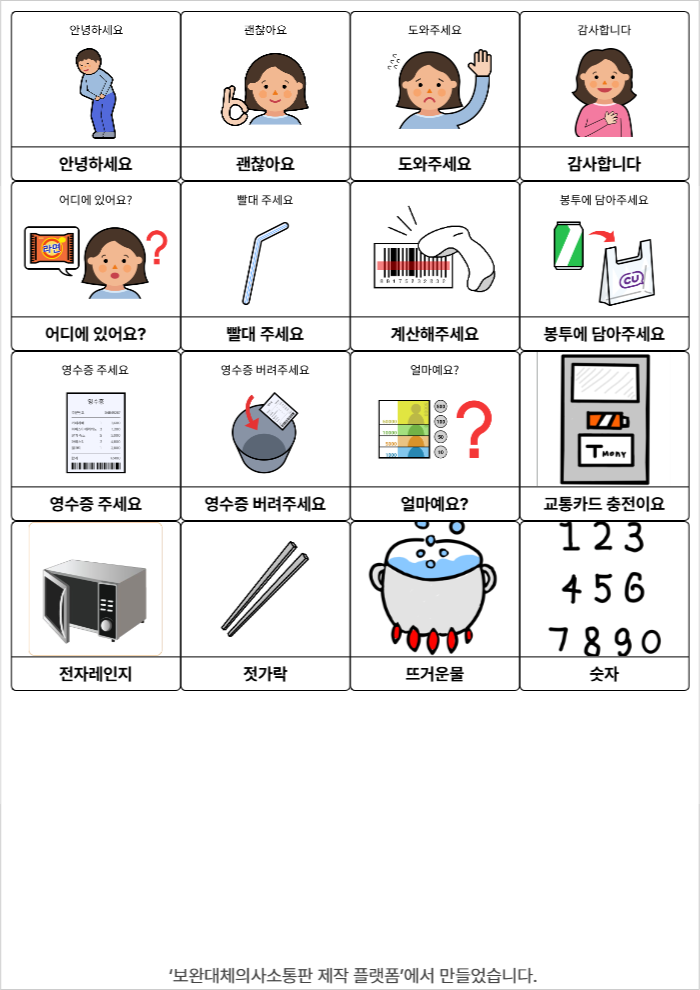 안녕하세요,괜찮아요,도와주세요,감사합니다,어디에 있어요?,빨대 주세요,계산해주세요,봉투에 담아주세요,영수증 주세요,영수증 버려주세요,얼마예요?,교통카드 충전,전자레인지,젓가락,뜨거운물,숫자서지우25/12/17