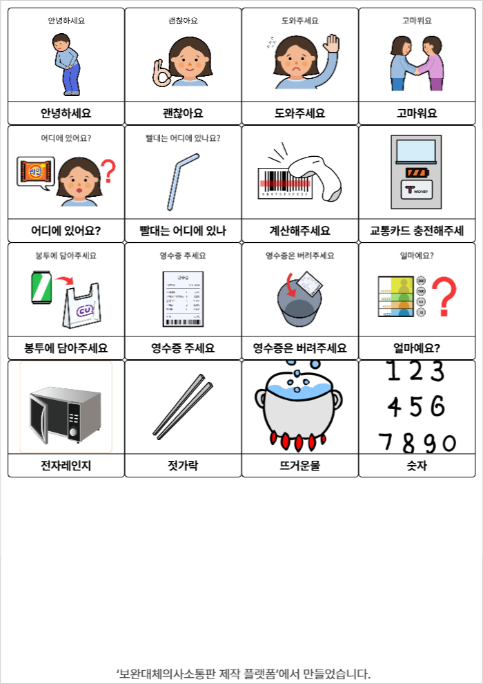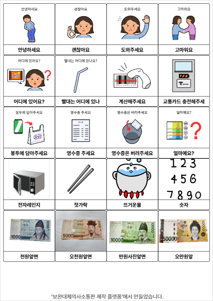 안녕하세요,괜찮아요,도와주세요,고마워요,어디에 있어요?,빨대는 어디에 있나요?,계산해주세요,교통카드 충전해주세요,봉투에 담아주세요,영수증 주세요,영수증은 버려주세요,얼마예요?,전자레인지,젓가락,뜨거운물,숫자,천원,오천원,만원,오만원서지우25/12/17
