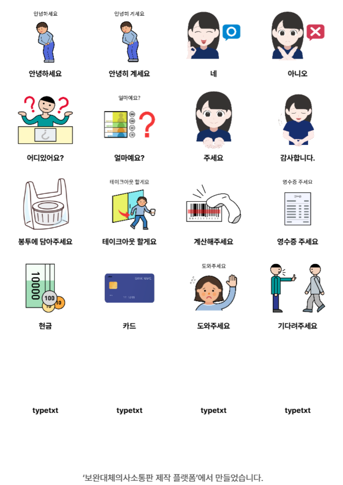 안녕하세요,안녕히 계세요,네,아니오,어디있어요?,얼마예요?,주세요,감사합니다.,봉투에 담아주세요,테이크아웃 할게요,계산해주세요,영수증 주세요,현금,카드,도와주세요,기다려주세요김소연25/10/12유닛의날(파리바게트) 2