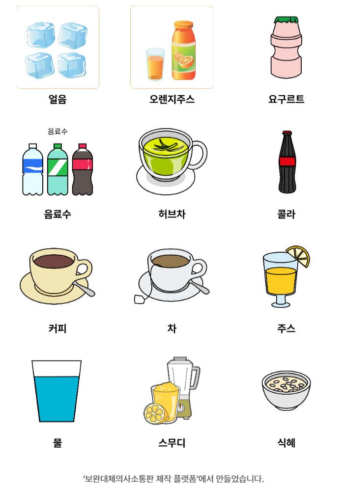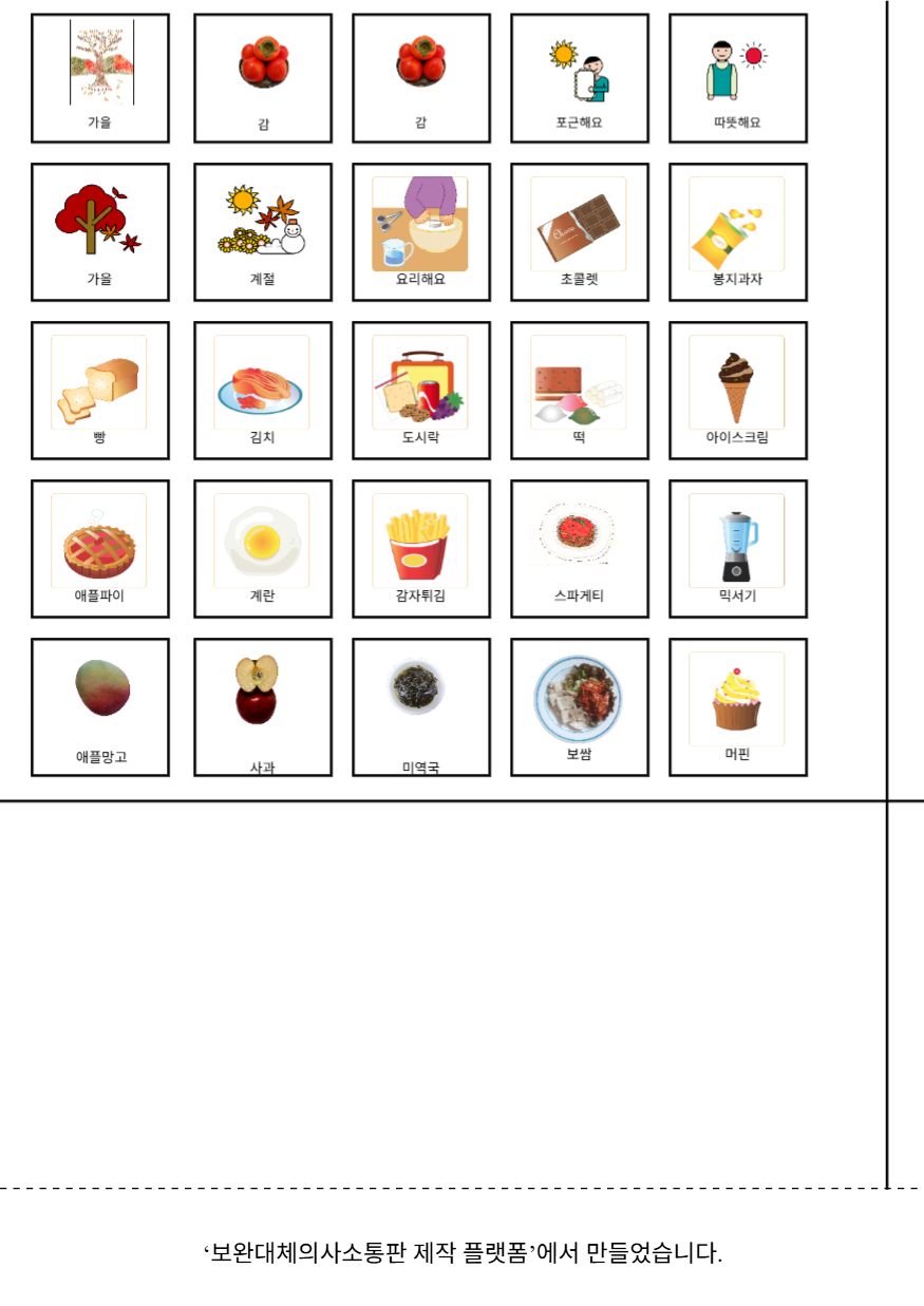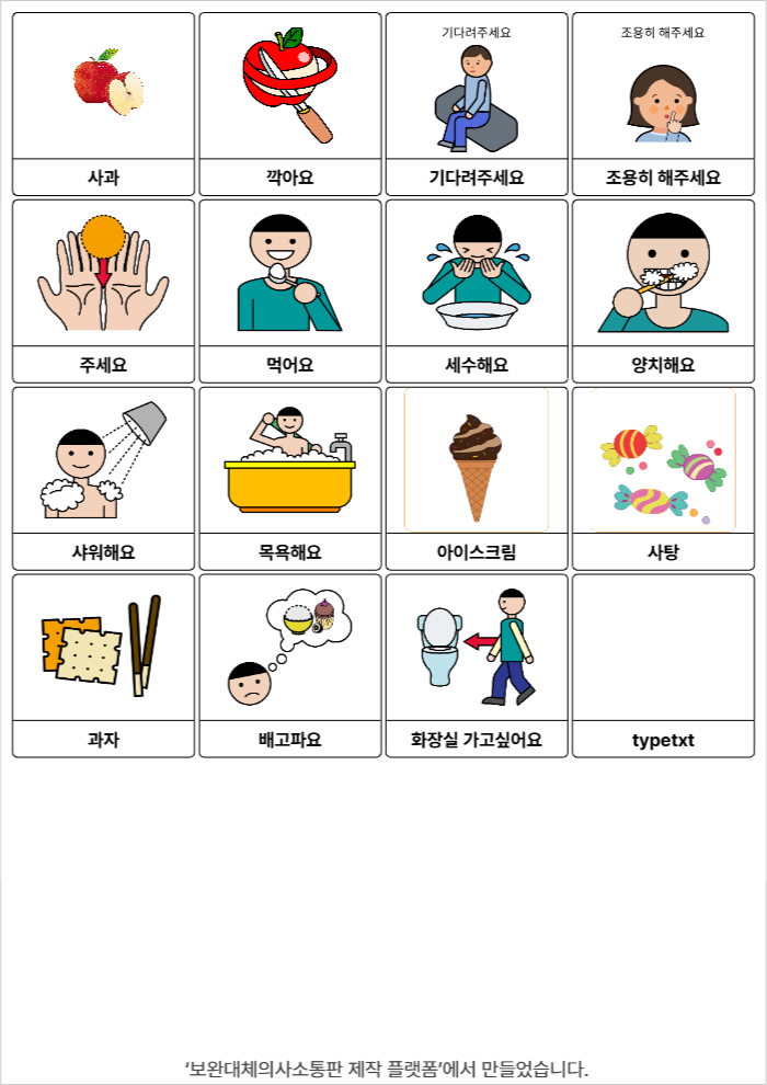 사과,깍아요,기다려주세요,조용히 해주세요,주세요,먹어요,세수해요,양치해요,샤워해요,목욕해요,아이스크림,사탕,과자,배고파요,화장실 가고싶어요이회승25/10/14과일음식