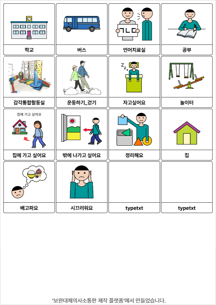학교,버스,언어치료실,공부,감각통합활동실,운동하기_걷기,자고싶어요,놀이터,집에 가고 싶어요,밖에 나가고 싶어요,정리해요,집,배고파요,시끄러워요이회승25/10/14학교치료실