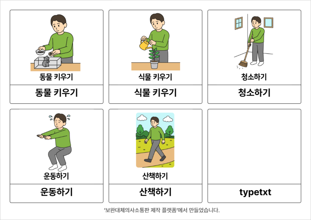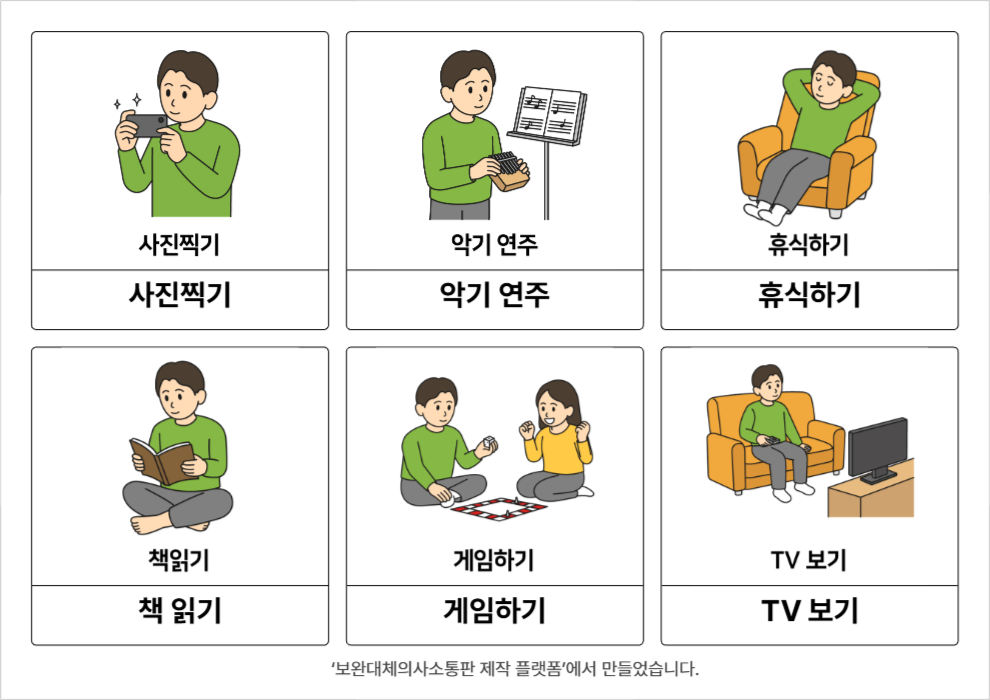 TV 보기,게임하기,책 읽기,휴식하기,악기 연주,식물 키우기,동물 키우기,청소하기,사진찍기,운동하기,산책하기윤수빈26/03/18개인여가