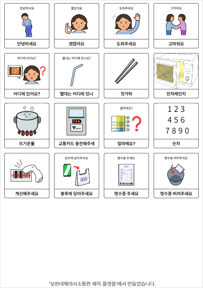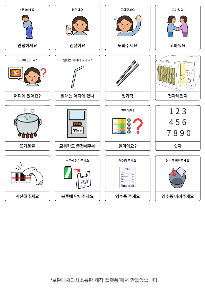 안녕하세요,괜찮아요,도와주세요,고마워요,어디에 있어요?,빨대,젓가락,전자레인지,뜨거운물,교통카드 충전,얼마에요?,숫자,계산해주세요,봉투에 담아주세요,영수증 주세요,영수증 버려주세요정은지25/10/08편의점