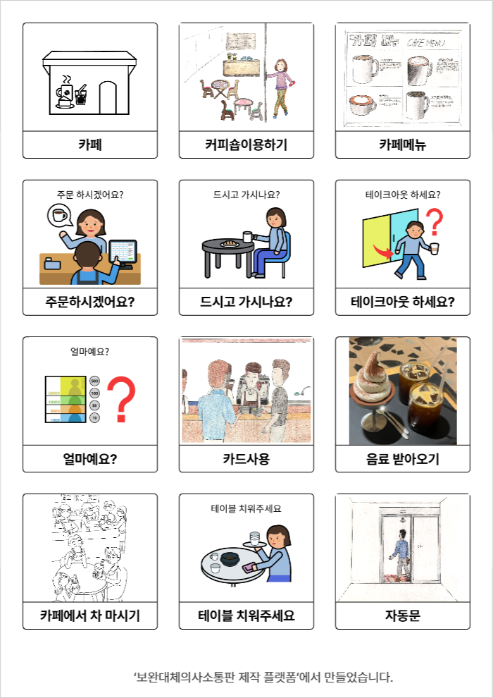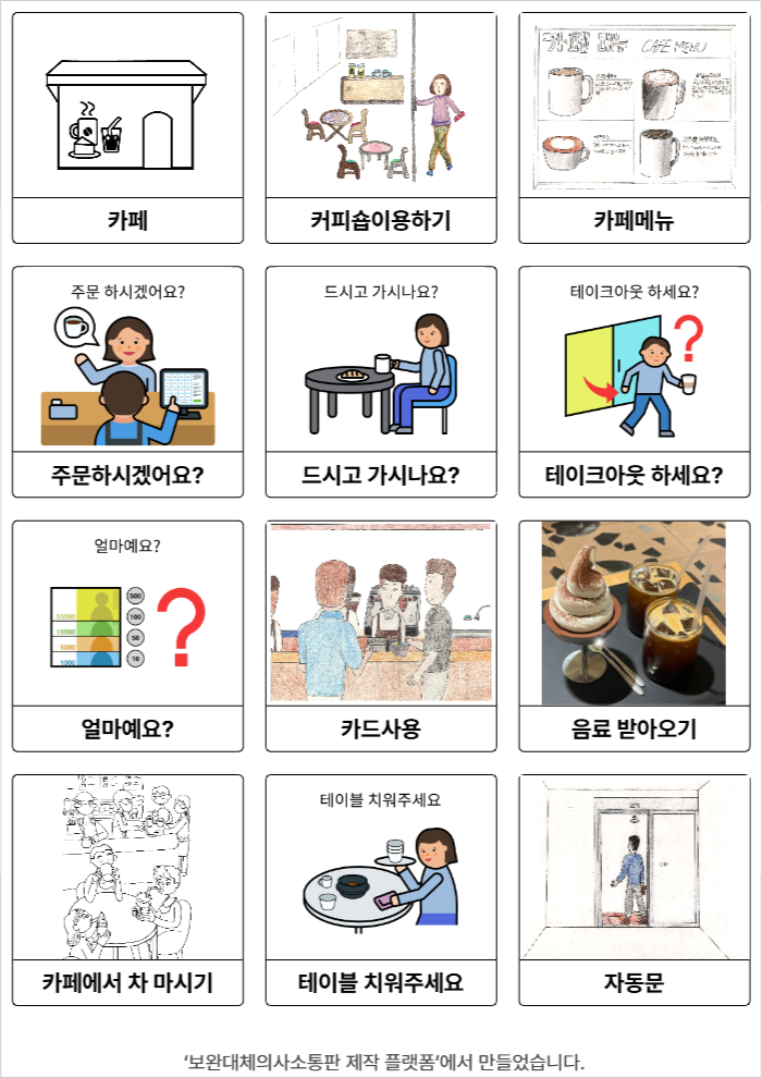 카페 이용하기,자리 확인하기,카페메뉴 보기,주문하시겠어요?,드시고 가시나요?,테이크아웃 하세요?,얼마예요?,카드사용,음료 받아오기,카페에서 차 마시기,테이블 치우기,교육원으로 가기문지훈25/10/10