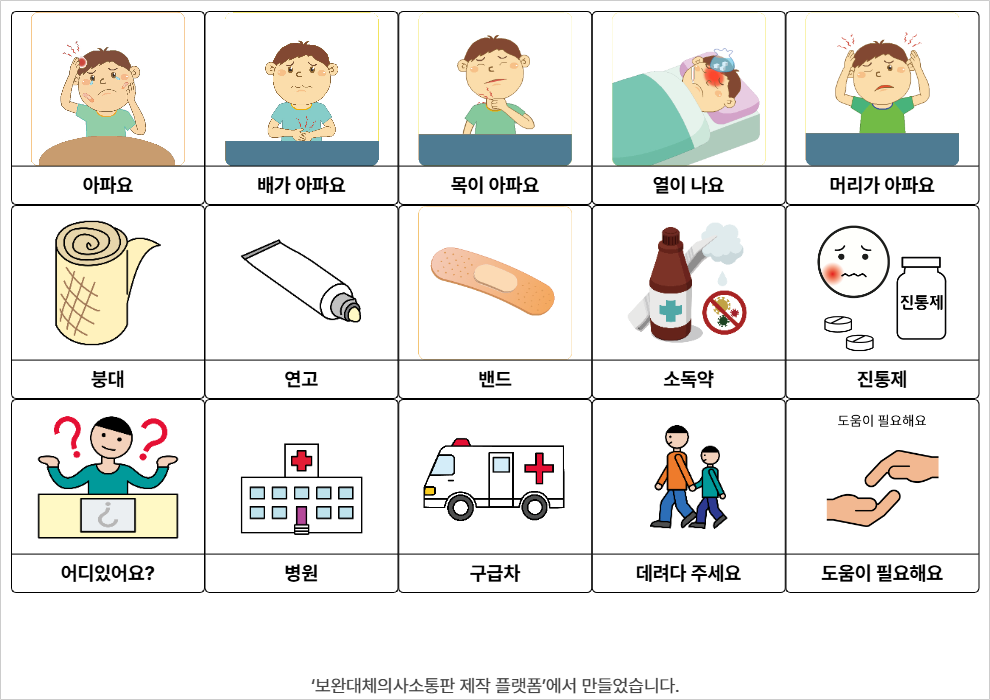 아파요,배가 아파요,목이 아파요,열이 나요,머리가 아파요,붕대,연고,밴드,소독약,진통제,어디있어요?,병원,구급차,데려다 주세요,도움이 필요해요엛25/10/10응급상황