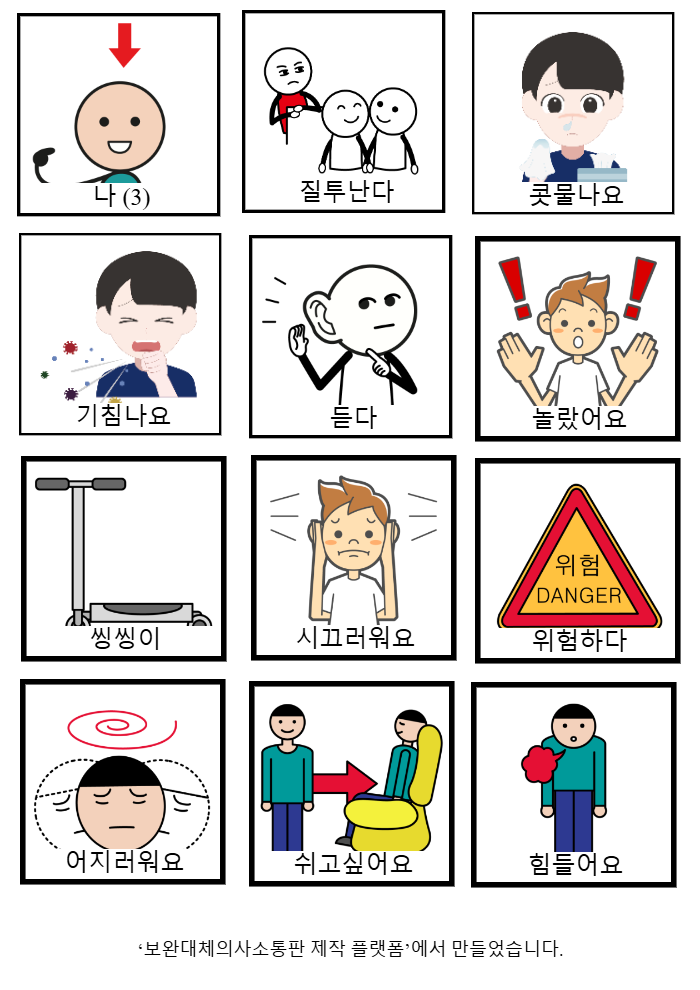나 (3),질투난다,콧물나요,기침나요,듣다,놀랐어요,씽씽이,시끄러워요,위험하다,어지러워요,쉬고싶어요,힘들어요박주혜26/03/16유승우7