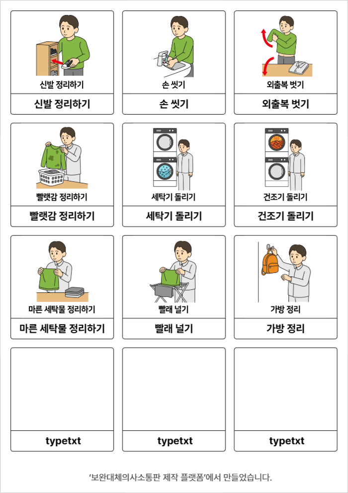 신발 정리하기,손 씻기,외출복 벗기,빨랫감 정리하기,세탁기 돌리기,건조기 돌리기,마른 세탁물 정리하기,빨래 널기,가방 정리윤수빈26/03/18외출 후