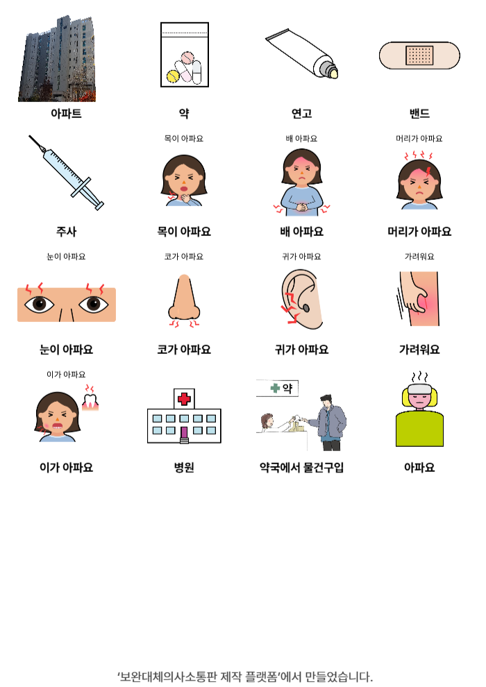 아파트,약,연고,밴드,주사,목이 아파요,배 아파요,머리가 아파요,눈이 아파요,코가 아파요,귀가 아파요,가려워요,이가 아파요,병원,약국,아파요이정수25/10/01