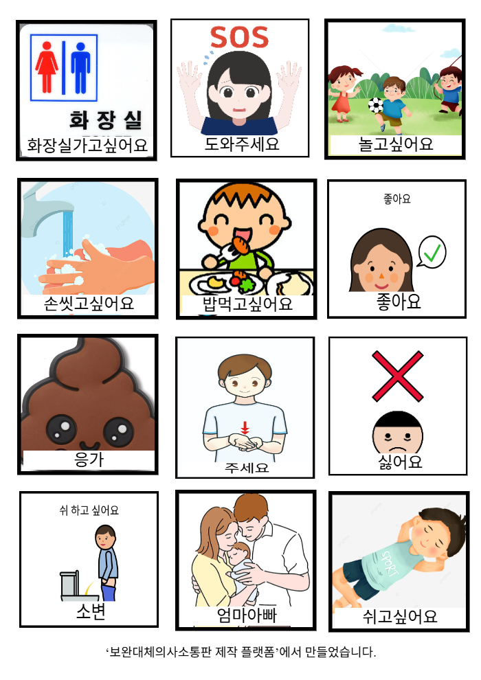주세요,도와주세요,소변,응가,응가,싫어요,좋아요,쉬고싶어요,밥먹고싶어요,놀고싶어요,화장실가고싶어요,손씻고싶어요,엄마아빠김젤리25/10/01유아 주로 쓰는 단어
