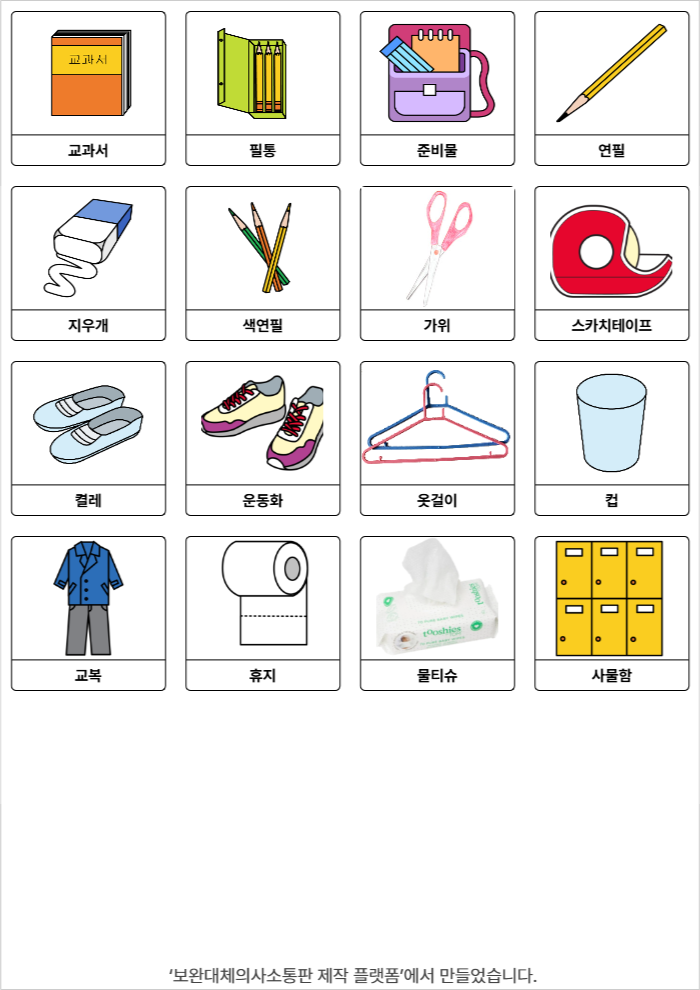 교과서,필통,준비물,연필,지우개,색연필,가위,스카치테이프,실내화,운동화,옷걸이,컵,교복,휴지,물티슈,사물함고은별25/10/05물건