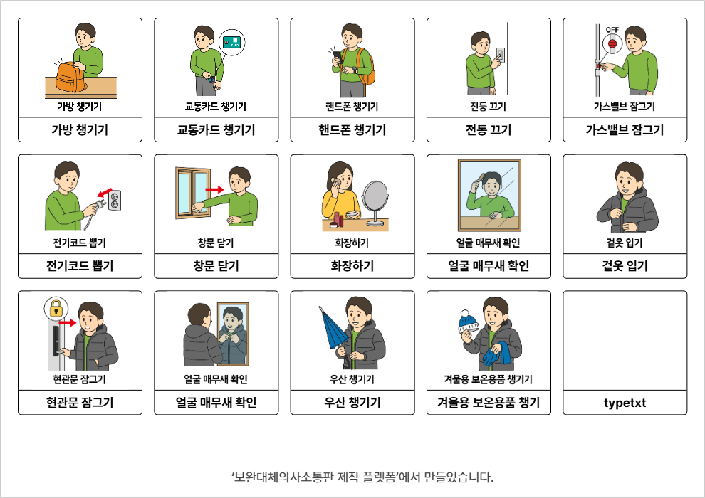 가방 챙기기,교통카드 챙기기,핸드폰 챙기기,전동 끄기,가스밸브 잠그기,전기코드 뽑기,창문 닫기,화장하기,얼굴 매무새 확인,겉옷 입기,현관문 잠그기,얼굴 매무새 확인,우산 챙기기,겨울용 보온용품 챙기기윤수빈26/02/25외출 준비