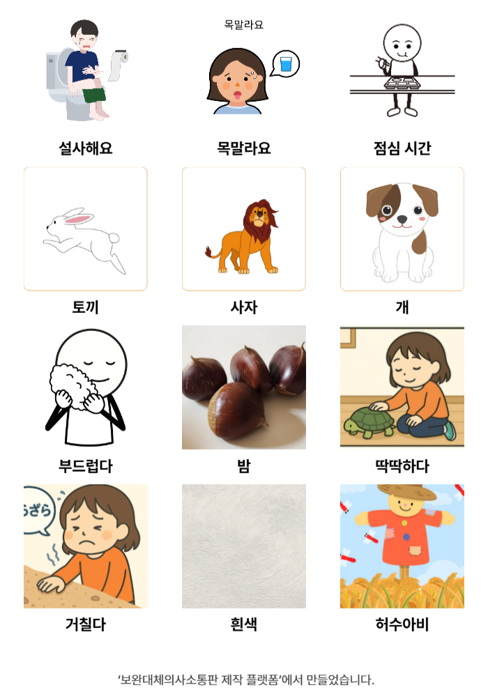 화장실 가고 싶어요,목말라요,밥 먹고 싶어요,토끼,사자,개,부드럽다,밤,딱딱하다,거칠다,하얀색,허수아비이나연25/11/25