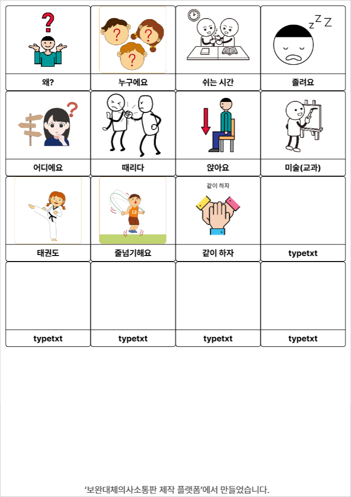 왜?,누구에요,쉬는 시간,졸려요,어디에요,때리다,앉아요,미술(교과),태권도,줄넘기,같이 하자조수진26/04/02