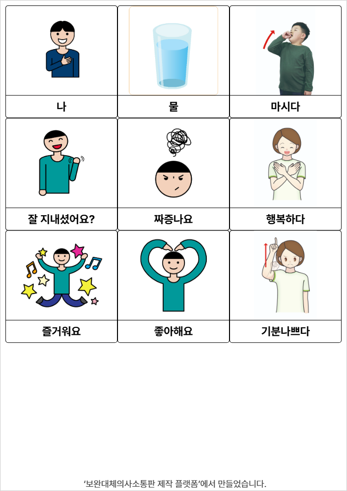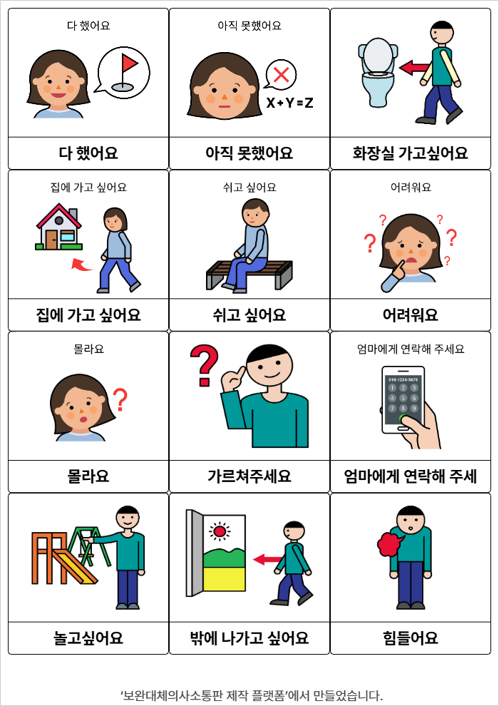 다 했어요,아직 못했어요,화장실 가고싶어요,집에 가고 싶어요,쉬고 싶어요,어려워요,몰라요,가르쳐주세요,엄마에게 연락해 주세요,놀고싶어요,밖에 나가고 싶어요,힘들어요학교26/03/30