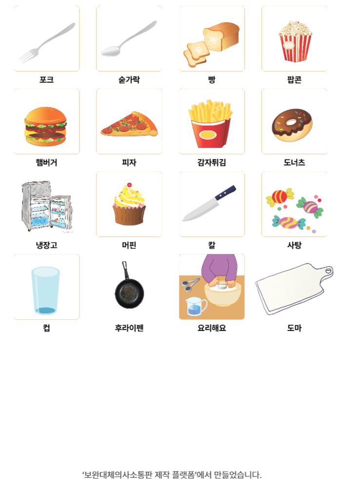 포크,숟가락,빵,팝콘,햄버거,피자,감자튀김,도너츠,냉장고,머핀,칼,사탕,컵,후라이펜,요리해요,도마코코26/03/30음식