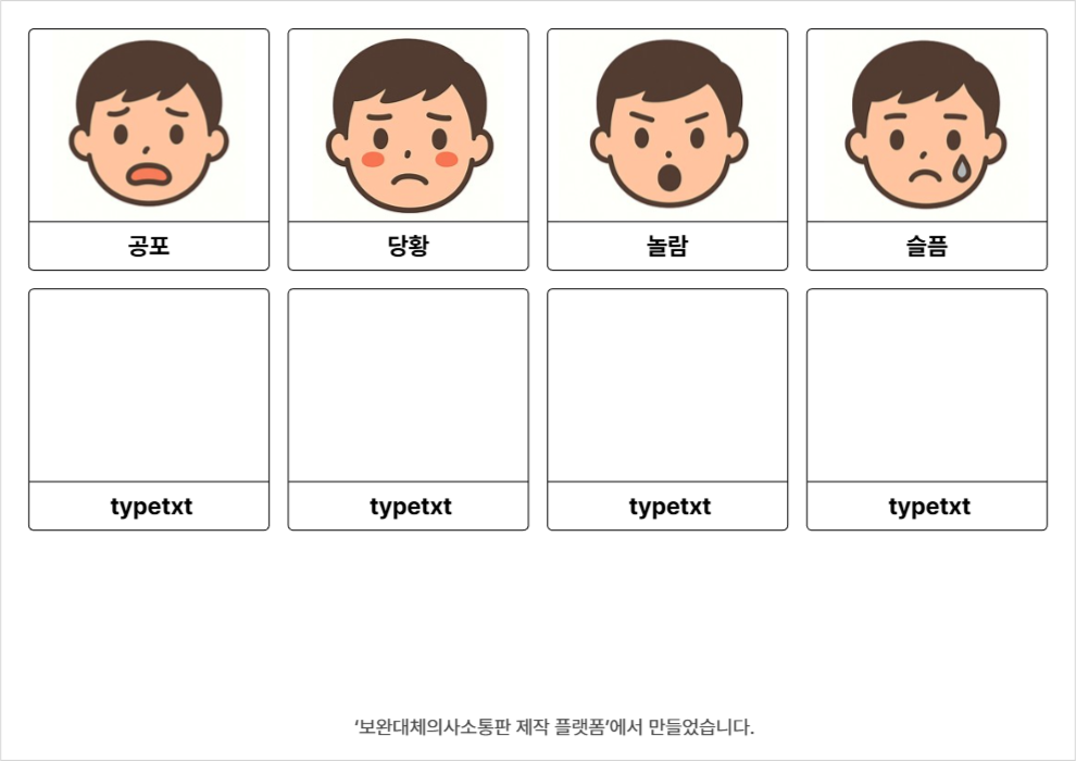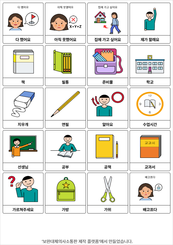 칠판,공부해요,선생님,친구들,점심시간,괴롭힘,안녕하세요,모르겠어요,도와주세요,다 했어요,아직 못했어요,가르쳐주세요,숙제가 있나요?,집에 가고 싶어요,같이 하자,보여줄래?,엄마에게 연락해 주세요,어려워요,화장실 가고 싶어요,점심시간김은주25/11/05학교