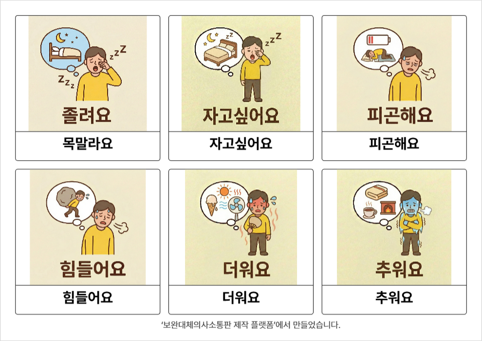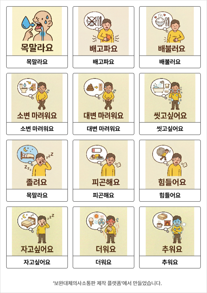 목말라요,배고파요,배불러요,소변 마려워요,대변 마려워요,씻고싶어요,목말라요,피곤해요,힘들어요,자고싶어요,더워요,추워요윤수빈26/01/15