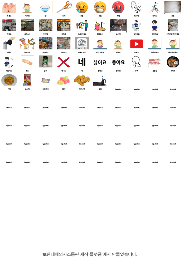 주세요,아파요,밥,가위,눈물,웃음,화남,토하다,씻어요,거품,다이소,시마스시,주먹밥,이마트,놀고싶어요,모래놀이,놀이터,설사해요,배아파요,손가락을 마주 잡고 문질러 주기,버려요,놀이공원,우리마트,코하쿠토,아빠랑 놀기,이가 아파요,아파요,유튜브,목이 아파요,머리가 아파요,까졌어요,밴드,콜라,아니오,네,싫어요,좋아요,우웩,삼겹살,돈까스,카레,소시지,치즈준비,젤리,치킨너겟,교회윤지유26/01/16260116