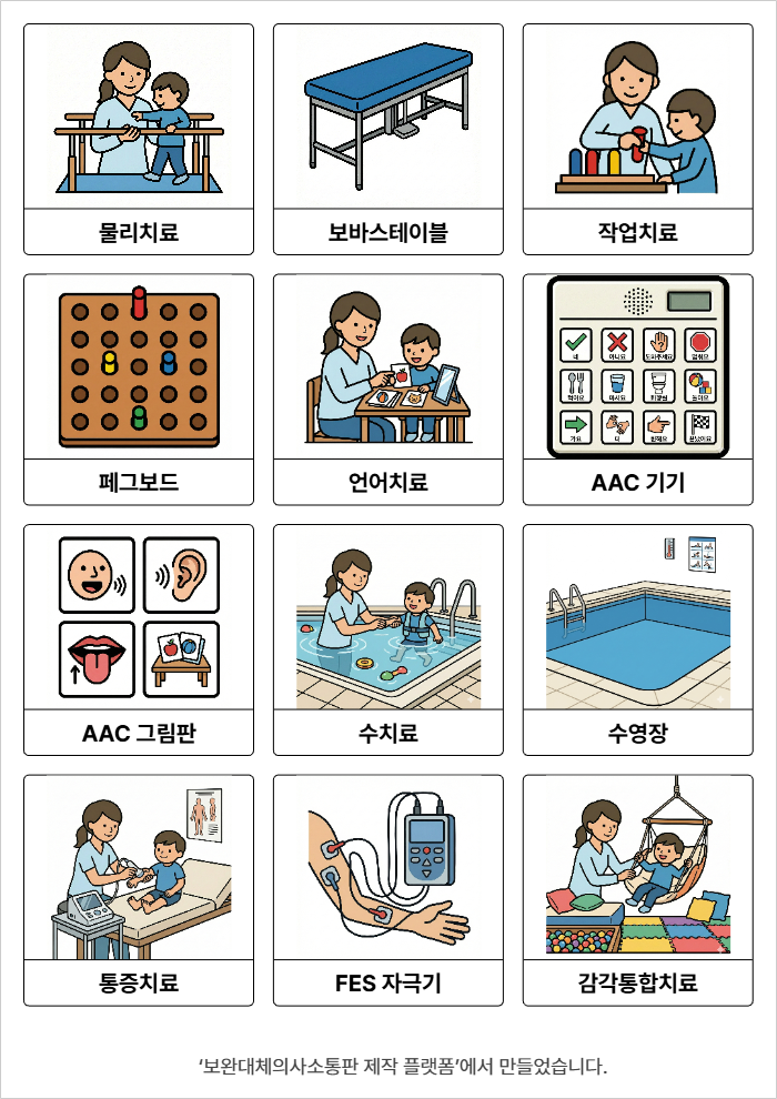 물리치료,보바스테이블,통증치료,FES 자극기,작업치료,페그보드,언어치료,AAC 기기,AAC 그림판,감각통합치료,수치료,수영장,AAC 그림판,언어치료실,의사소통판윤수빈26/01/19재활치료